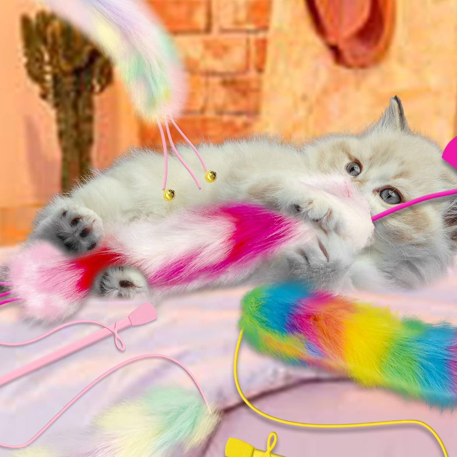 • Super Value: rainbow cat wand toy Includes 4 cat teaser wands. Colorful furry tail combined with bells will stimulate your cat’s interest in hunting.