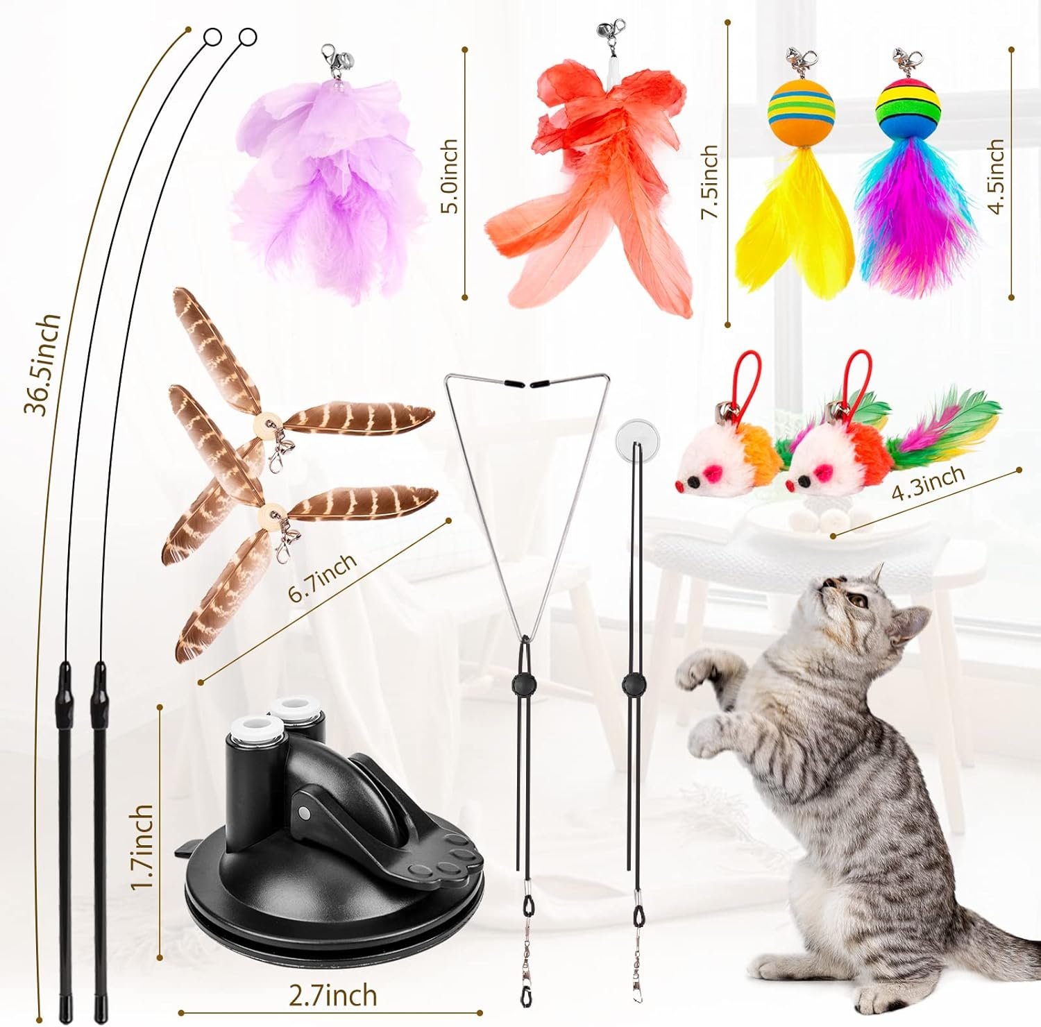 • [3 in 1 Cat Toys Set]- Package contains 2 suction cups, 2 cat wands, 2 fur balls, 2 mice toys, 2 worm toys, 4 feather toys, 2 ropes, 2 sticky pads, 1 triangular clip. All replacements are universal, they are durable and will keep your cat interested.